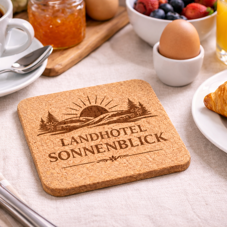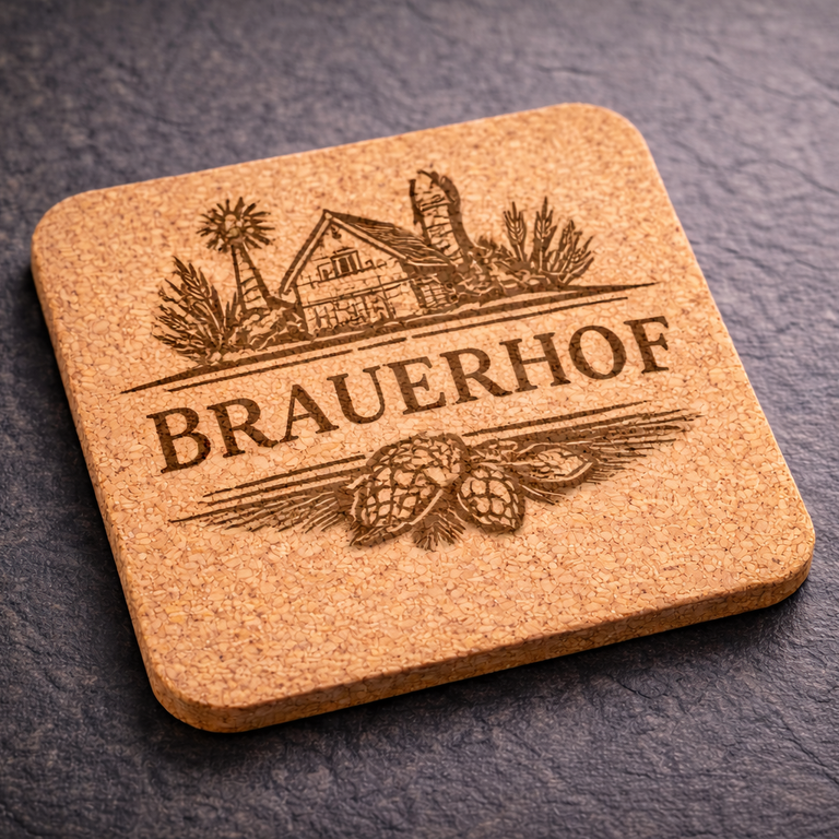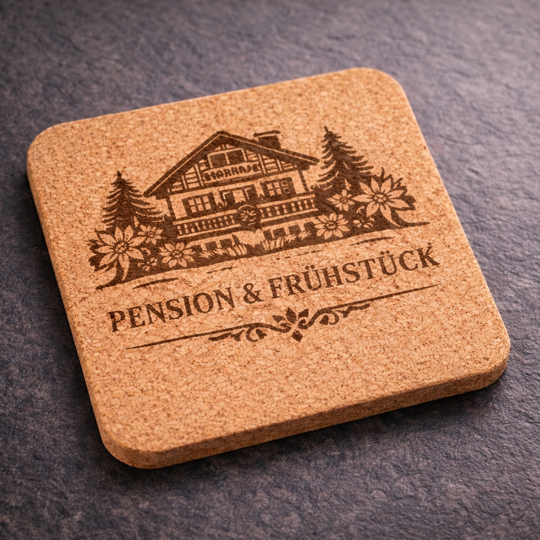 Unsere Korkuntersetzer werden mit moderner Lasertechnik präzise nach deinen Wünschen graviert — egal ob Logo, Text oder individuelles Motiv.