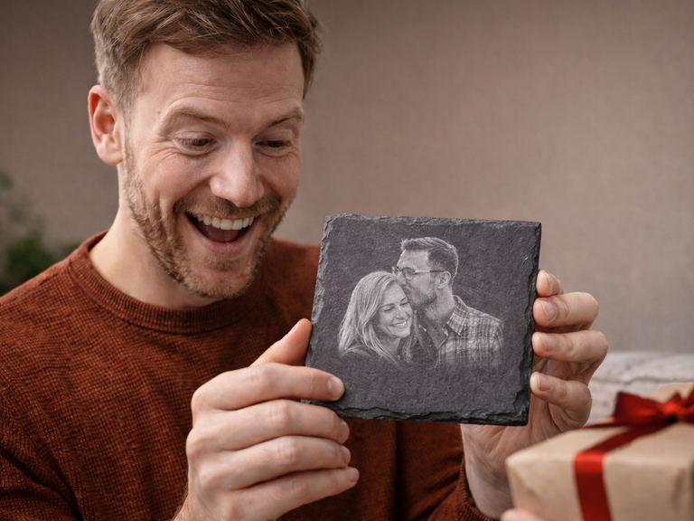 Wir gravieren dein persönliches Wunschmotiv oder Foto auf eine 10 × 10 cm echte Schiefertafel.